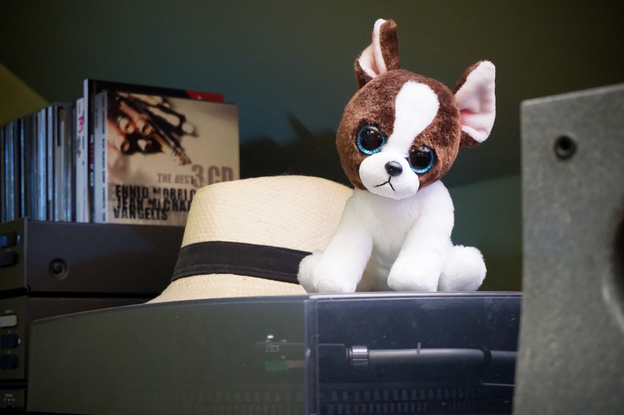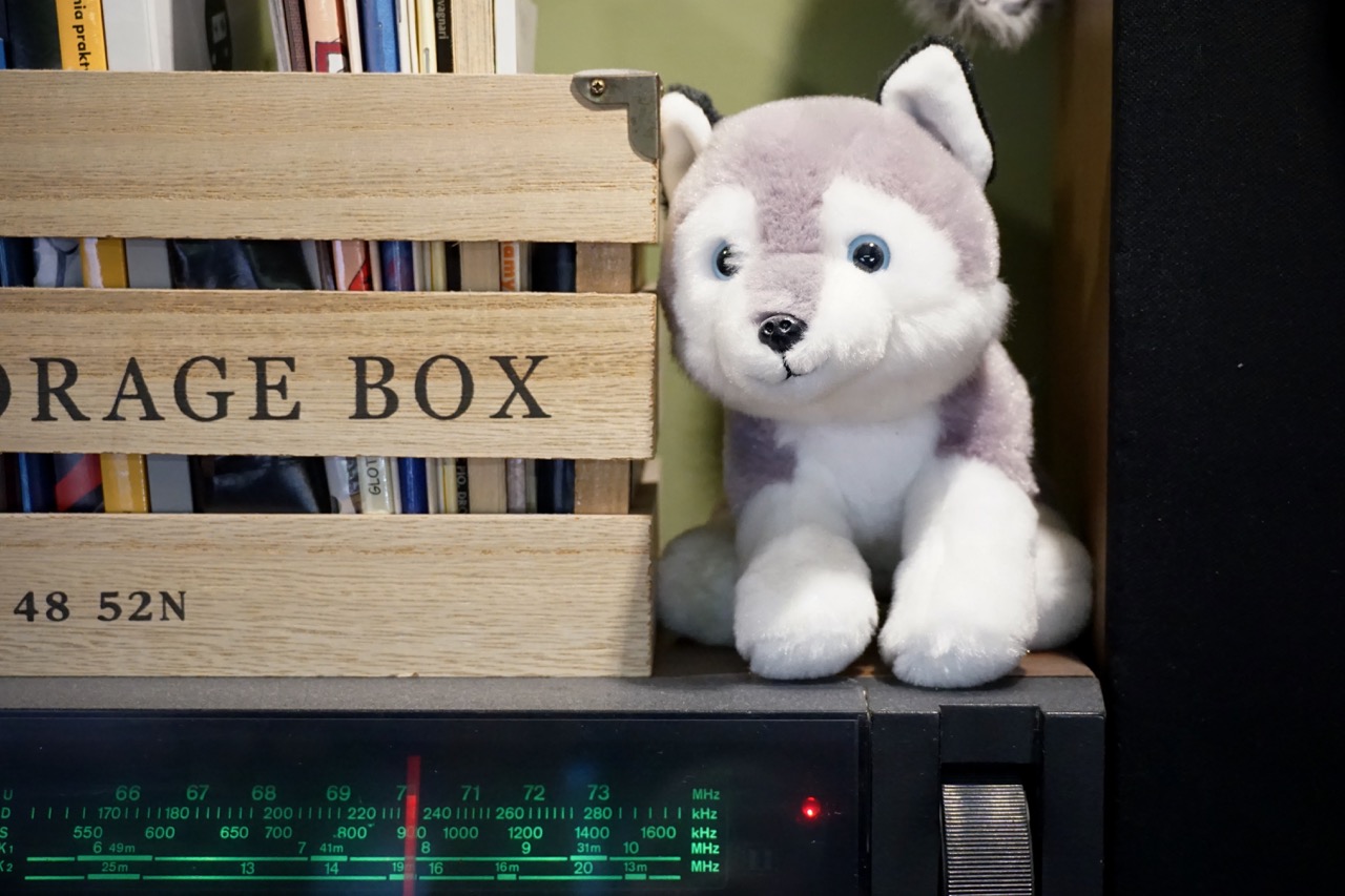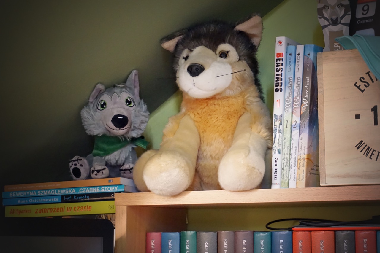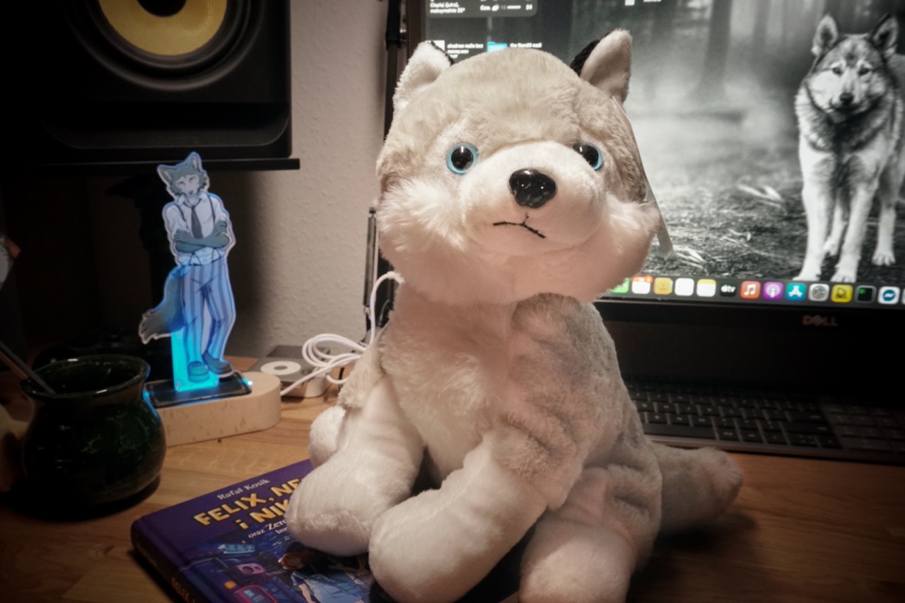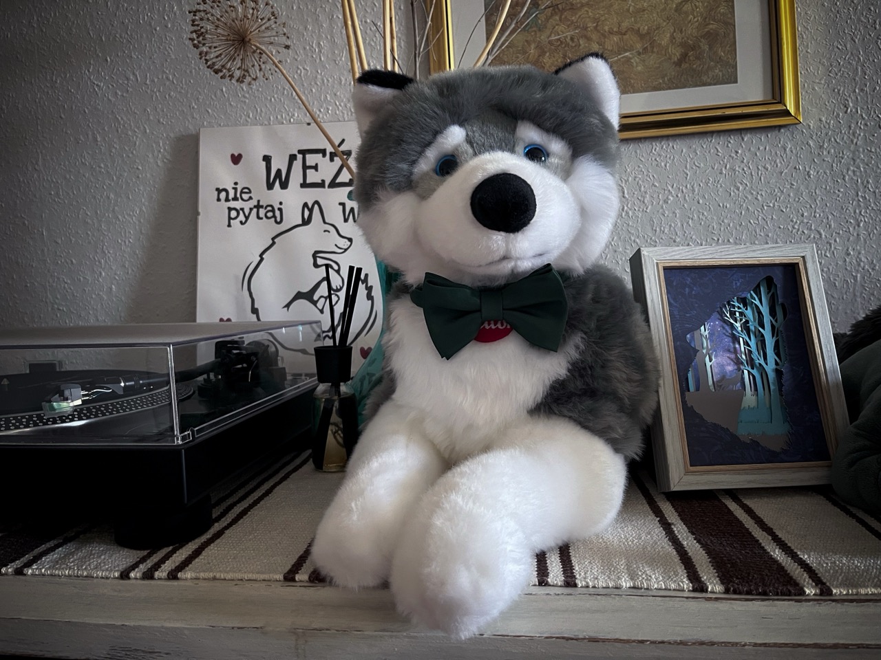 Duży wilczek, pierwszy zakup w nowym mieszkaniu po przeprowadzce. Siedzi zaraz obok gramofonu i Nadisia.