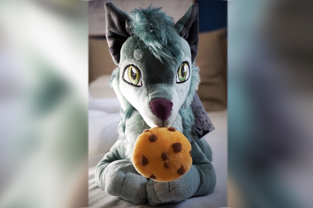 Maskotka fursony Nadiego, pozycja leżąca. Kolorystycznie odwzorowuje fursonę z arkusza referencyjnego. Ciasteczko na magnes, trzymające się pyszczka.